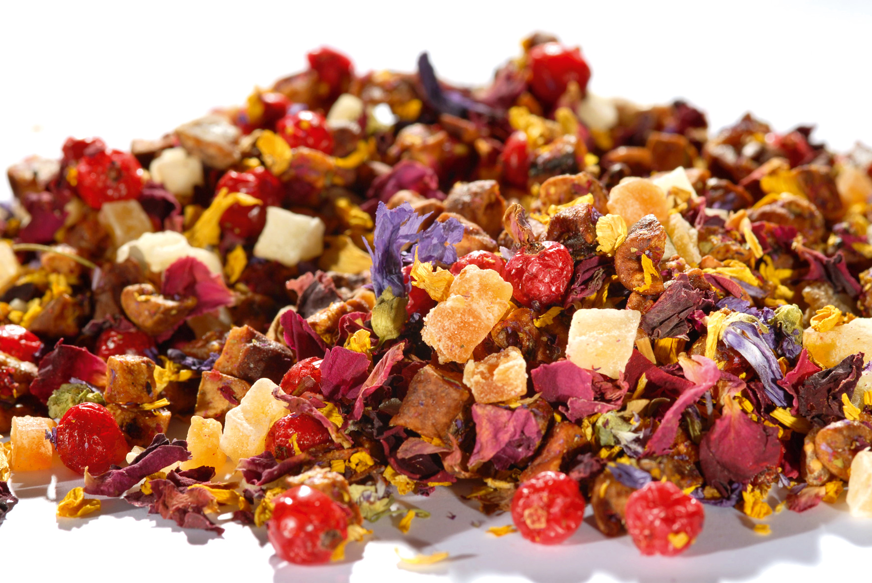 Birnenstücke (56%), Ananasstücke (10%) (Ananas, Zucker, Säuerungsmittel: Zitronensäure), Papayastücke (Papaya, Zucker), Mangostücke (Mango, Zucker, Säuerungsmittel: Zitronensäure), Dattelstücke, Feigenstücke, Rosenblütenblätter, Sonnenblumenblüten, Aroma, Rote Johannisbeeren, Säuerungsmittel: Weinsäure, Malvenblüten.