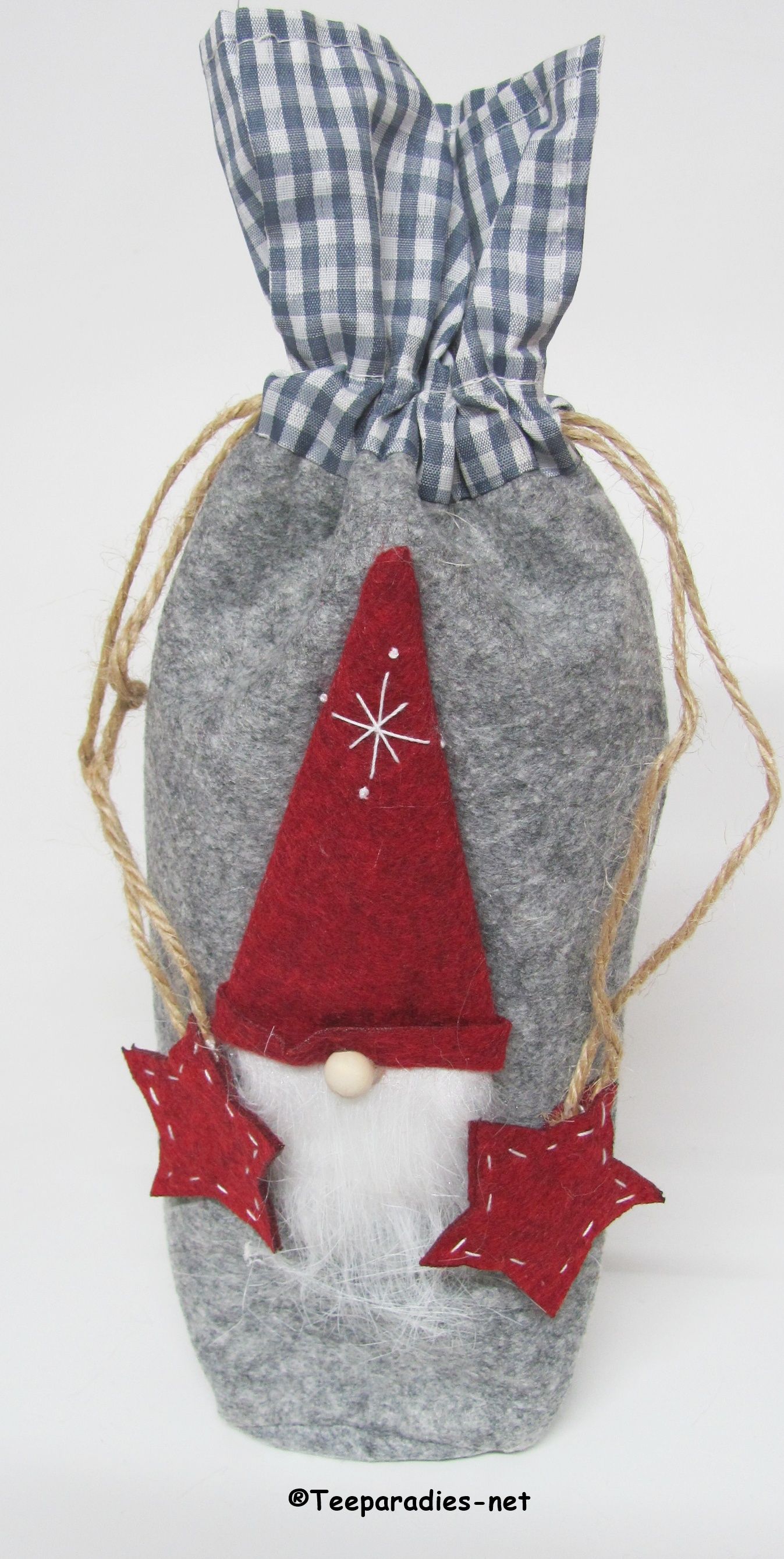 A festive gray bag, sewn from felt and checked fabric, decorated with a bearded elf. The ends of the drawstrings are decorated with a red felt star.