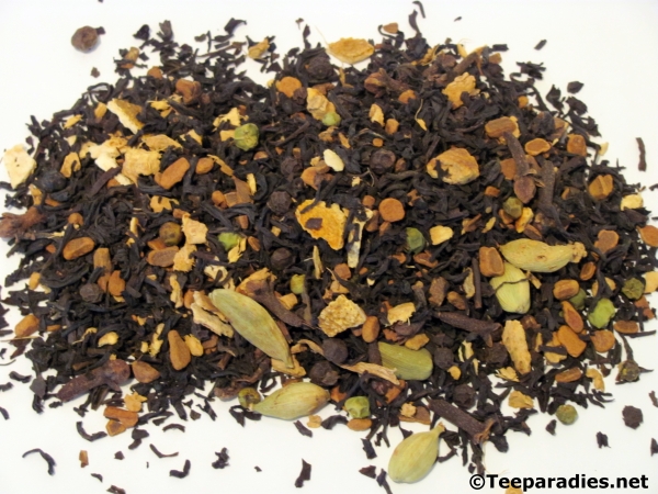 Zutaten: Schwarzer Tee, Zimtstücke, Kardamom, Nelken, schwarzer Pfeffer, Ingwer, grüner Pfeffer, Orangenschale.