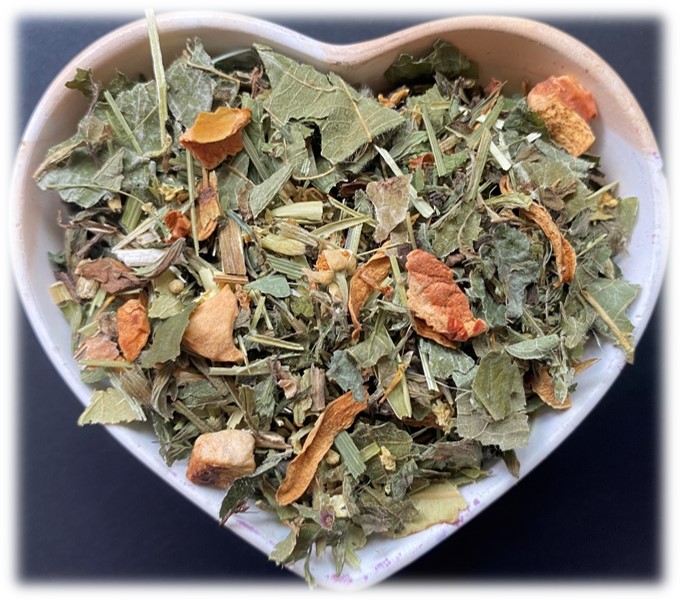 Zutaten: Grünhafer, Melissenblätter, Pfefferminze, Holunderblüten, Schafgarbe, Apfelstücke, Brombeerblätter, Löwenzahnblätter, Lindenblüten, Spitzwegereich, Orangenblütenblätter aus kontrolliert biologischem Anbau.