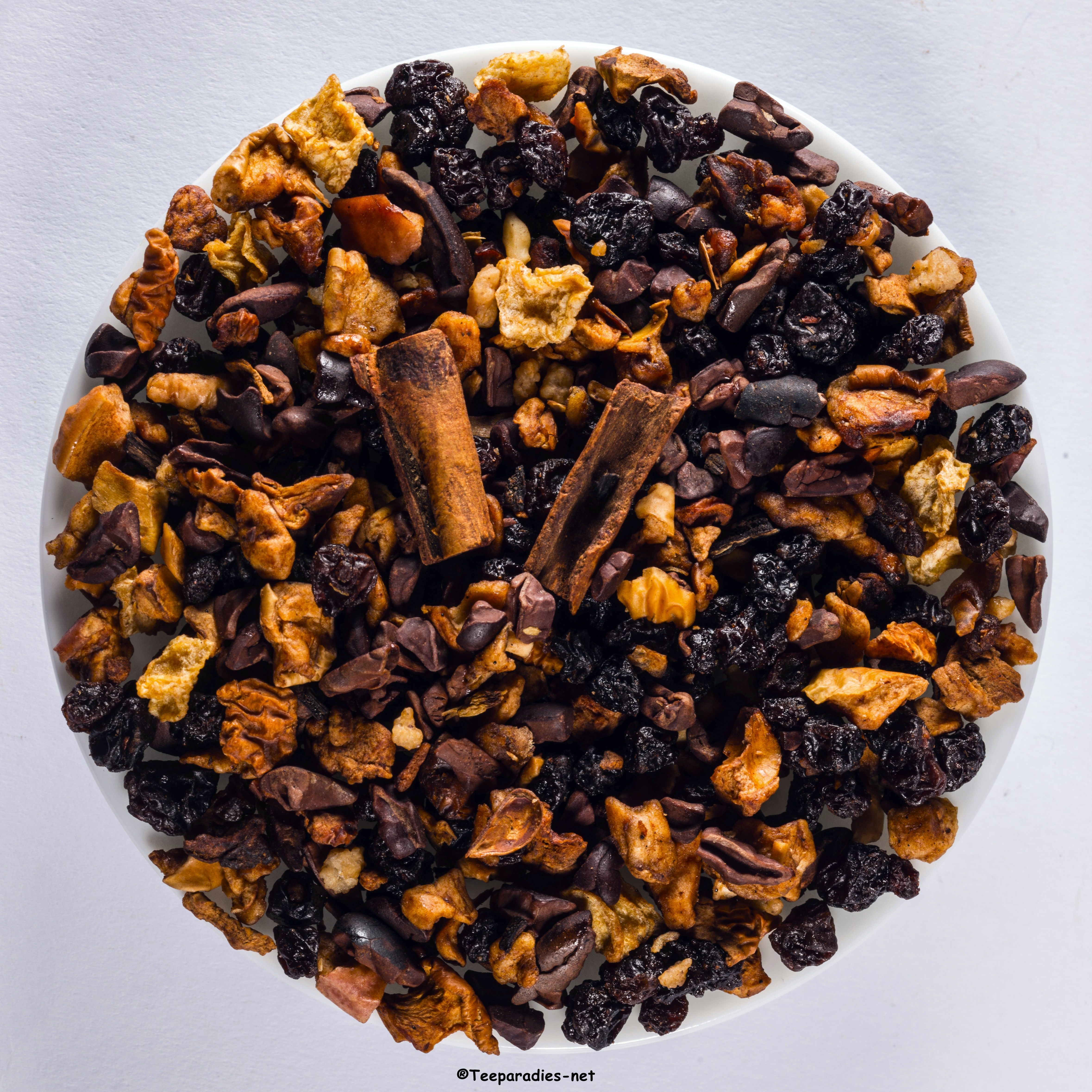 Zutaten: Korinthen (Korinthen, Trennmittel: pflanzliches Öl), Apfelstücke (geröstet), Kakaokernbruch, Zimtröllchen, natürliches Aroma, Krokantstücke (Zucker, Haselnuss, Karamellzuckersirup), Pfirsichstücke gefriergetrocknet, Vanillestücke